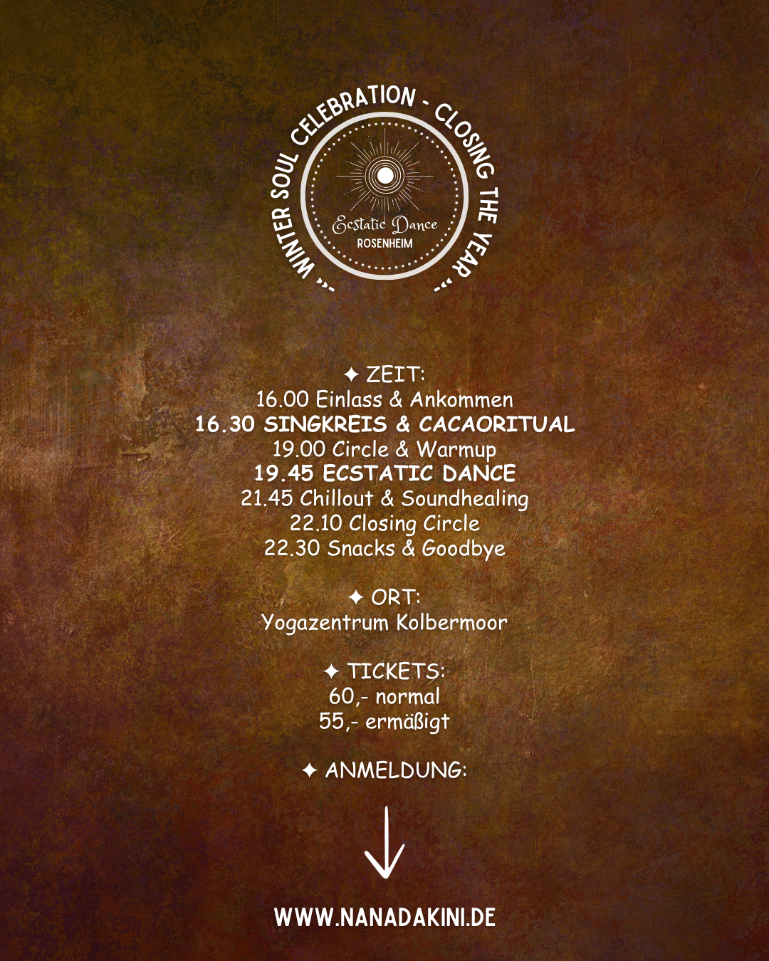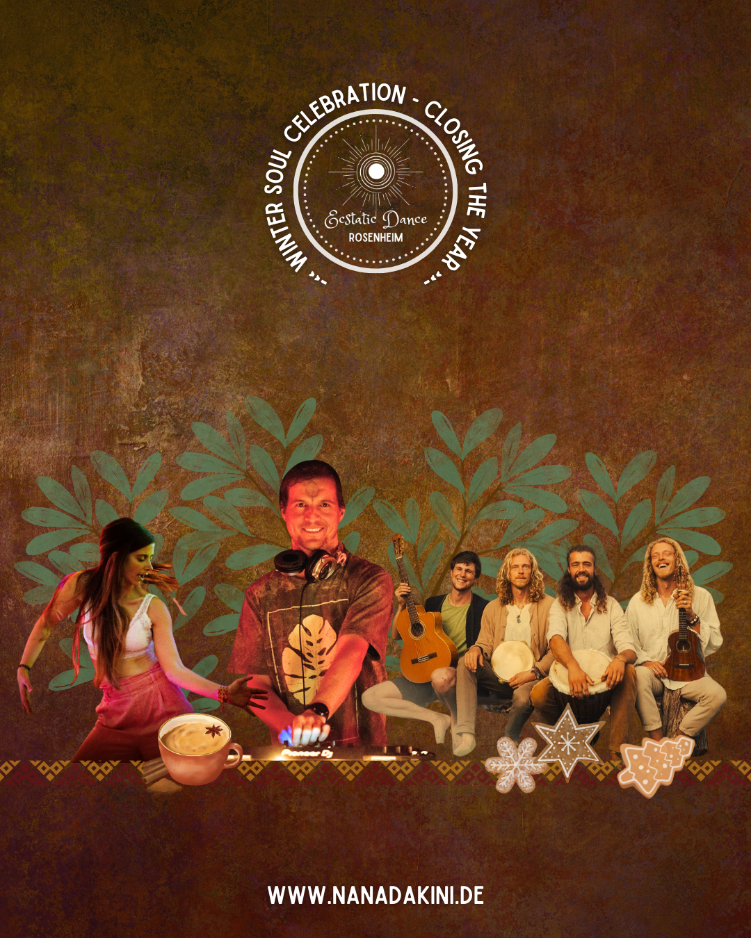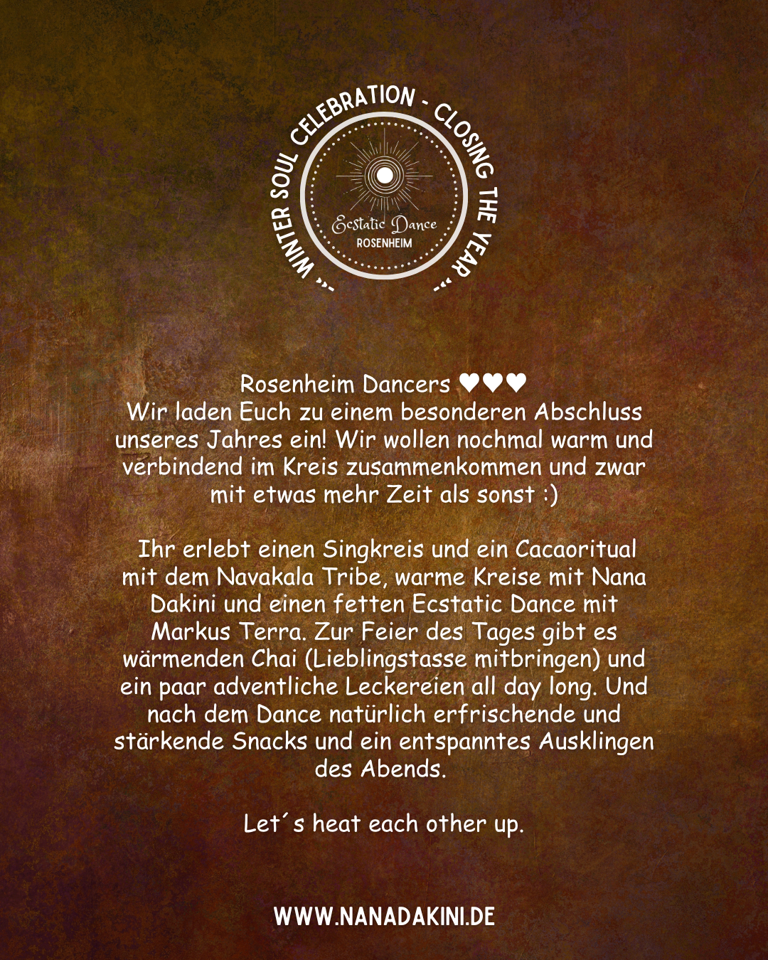 Wir laden Euch zu einem besonderen Abschluss unseres Jahres ein! Wir wollen nochmal warm und verbindend im Kreis zusammenkommen und zwar mit etwas mehr Zeit als sonst :) Dafür haben wir den Navakala Tribe eingeladen, der uns vor dem Dance mit einem Singkreis und einem Cacaoritual verwöhnen wird. Danach erlebt Ihr ein kurzes Warmup mit Nana Dakini und dann einen warm-winterlichen Ecstatic Dance mit Markus Terra! Anschließend lassen Euch die 4 Männer des Navakala Tribes sanft wieder landen.